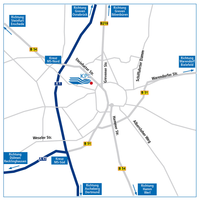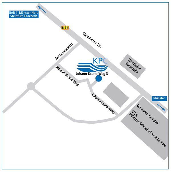 BAB A1 Abfahrt Münster-Nord, Richtung Münster. Die B54 aus Richtung Steinfurt stadteinwärts auf der Steinfurter Straße. An der vierten Ampel nach Leoland/Burger King rechts in den Johann-Krane-Weg. Nach ca. 150 m rechts in die Sackgasse (Johann-Krane-Weg). Bürogebäude auf der rechten Seite (Johann-Krane-Weg 8).